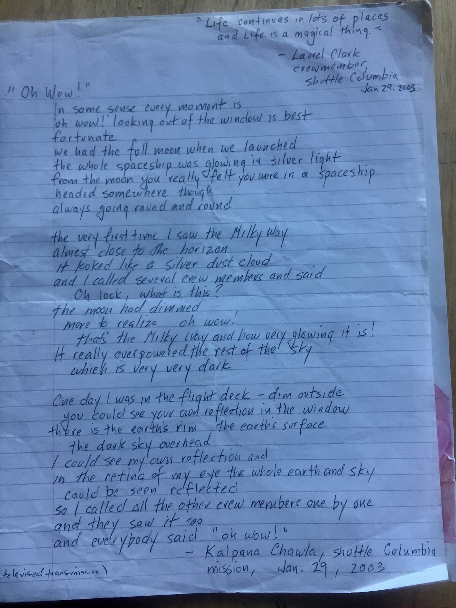This is prose poetry from flight deck of Columbia which was lost on the sky over Texas. It’s just in the crate of poems: