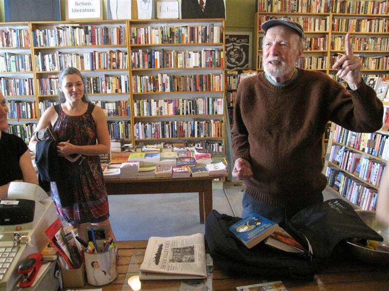 Pete Seeger was staying at Carmen’s in Noe Valley. And we at her local used bookstore sold not only books, but music too, and played American Roots Music all day long; the owner used to routinely hand me a check to go over to Down Home Music and buy all the latest reissues of Cajun and Bluegrass and Stringband Old Timey and New Orleans Trad Jazz- we’d play that music constantly. So as a surprise to me Carmen actually sneaked Pete Seeger in the door when I was shelving books in back.