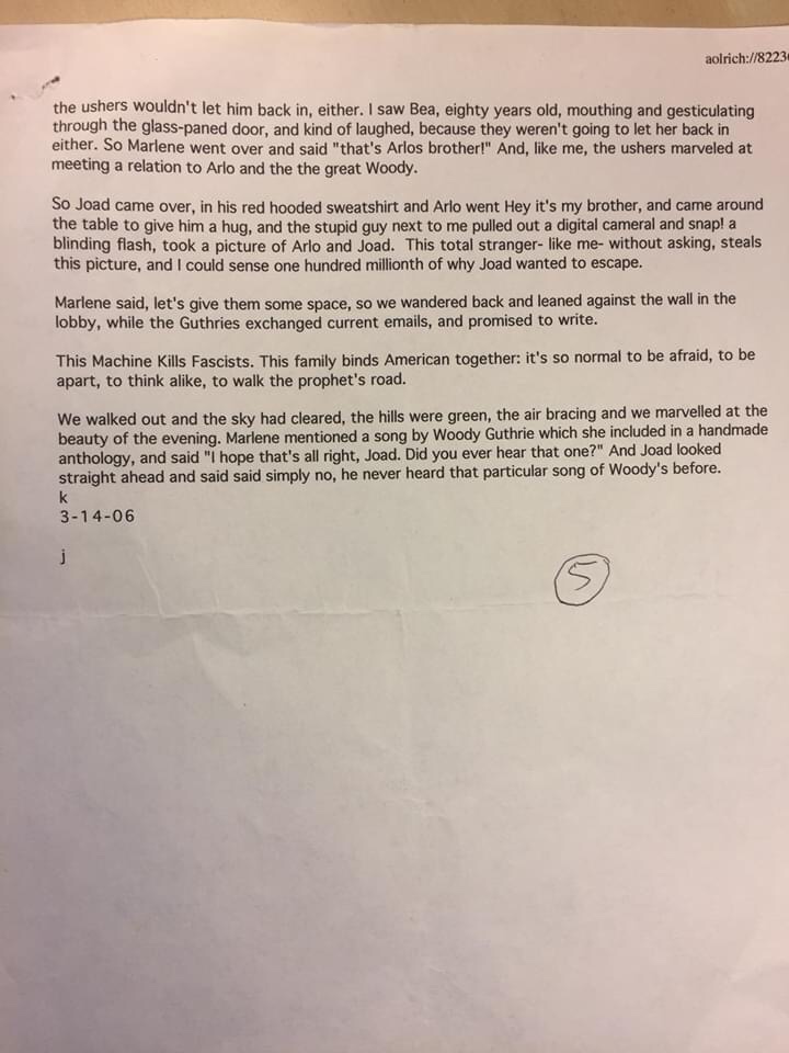 I saw Bea, eighty years old, mouthing and gesticulating through the glass-paned door. Marlene went over and explained, “That’s Arlo’s brother!” And, like me, the ushers seemed to marvel at meeting a relation to Arlo and the great Woody.