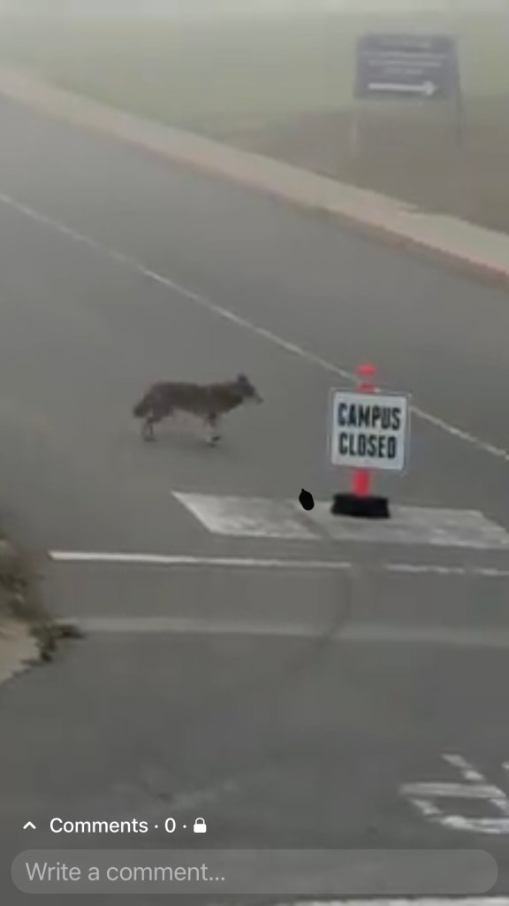 The coyote is watching us drive by. We’re going to be late for the train. For us, it’s 8 am.