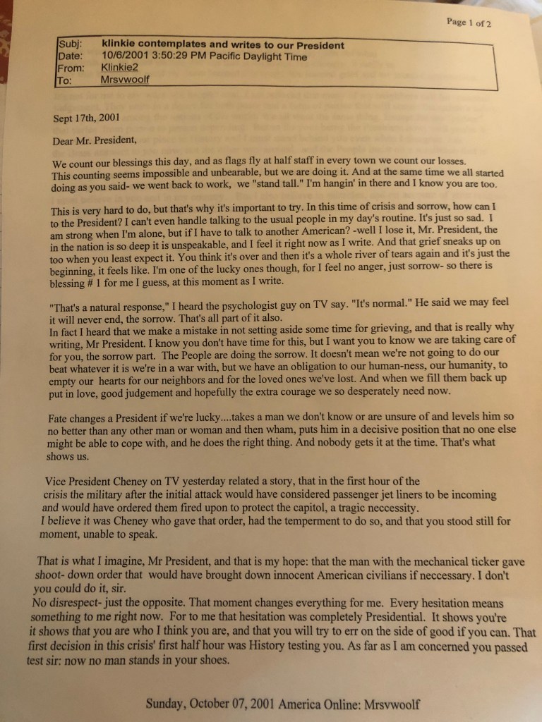The following was a spontaneous reaction to the tragedy of the Sept 11, 2001 attacks on the World Trade Center and the Pentagon and the loss of Flight 93.