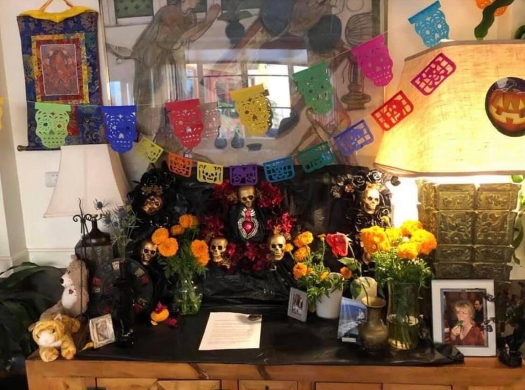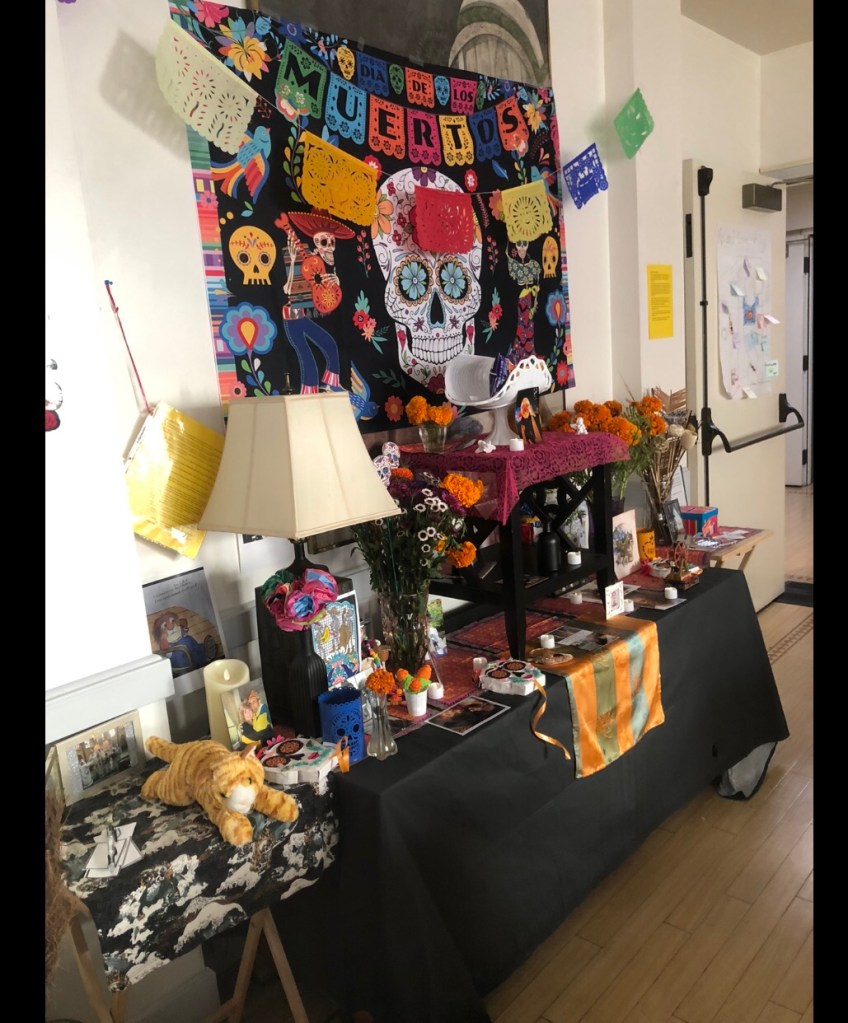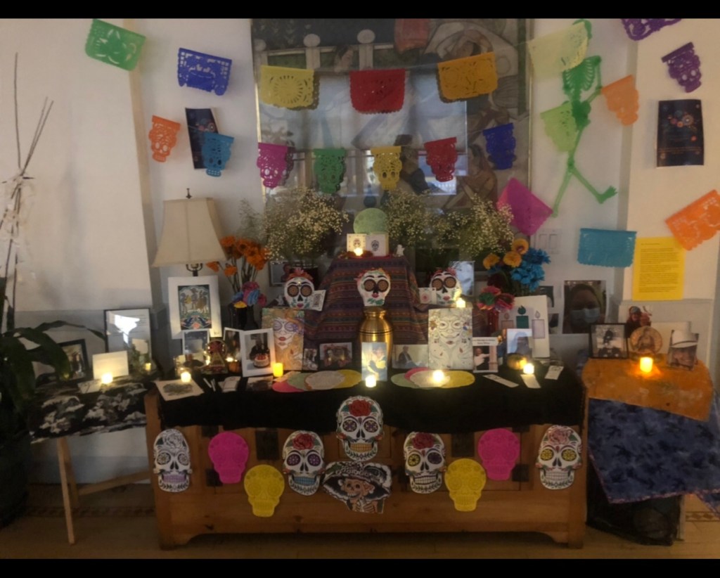 Thank you Mary Anne Voss for developing the idea into reality as a team. And to Augustina Ramos Silva from Oaxaca where the festival comes from, for approving and encouraging and providing the beautiful wall hanging. She is visiting her mother (in her nineties) in Mexico, and they definitely have their resplendent “ofrenda” there.